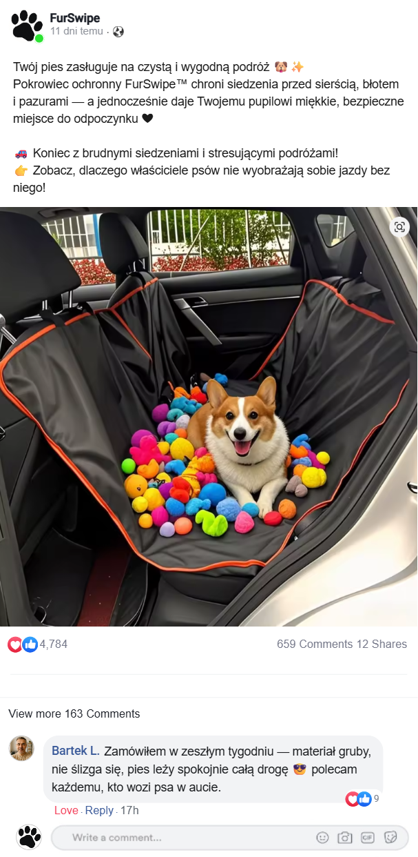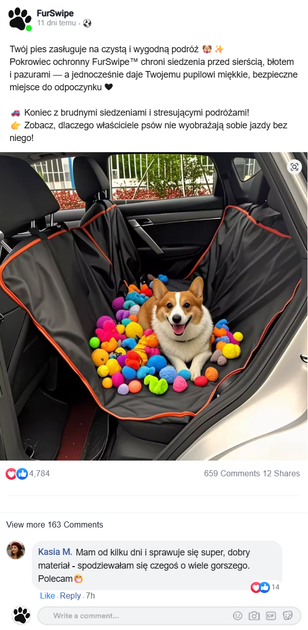 potwierdza, że pokrowiec chroni siedzenia przed sierścią, błotem i pazurami.